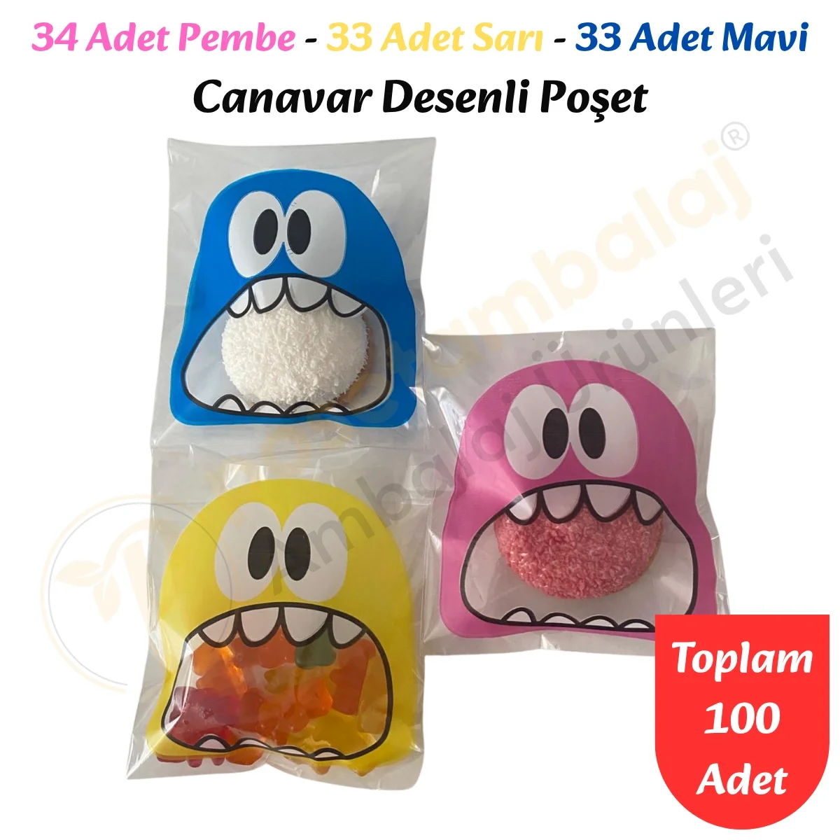 Pembe - Sarı - Mavi Renkli Canavar Desenli 10×15 cm Cake Pop & Kurabiye Poşeti • 100 Adet