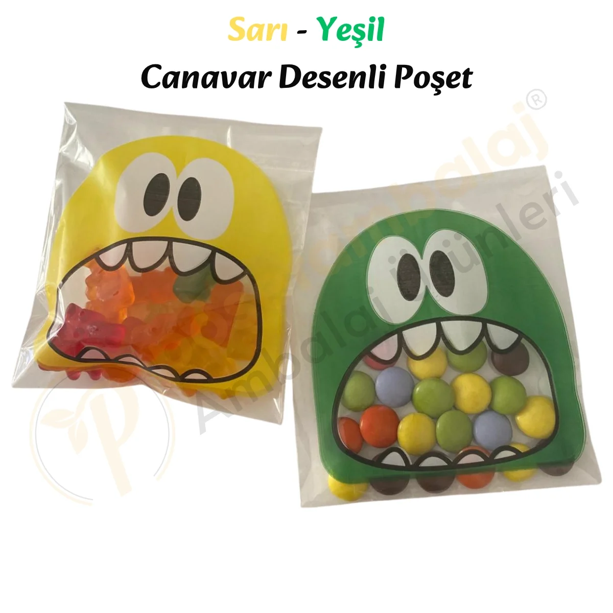 Bu özel canavar desenli poşetler, küçük tatlılarınızı (cake pop, kurabiye, mini kek) hem korur hem şık bir sunum sağlar. 10×15 cm ölçüsü ile kompakt ama etkileyici bir ambalaj çözümüdür.