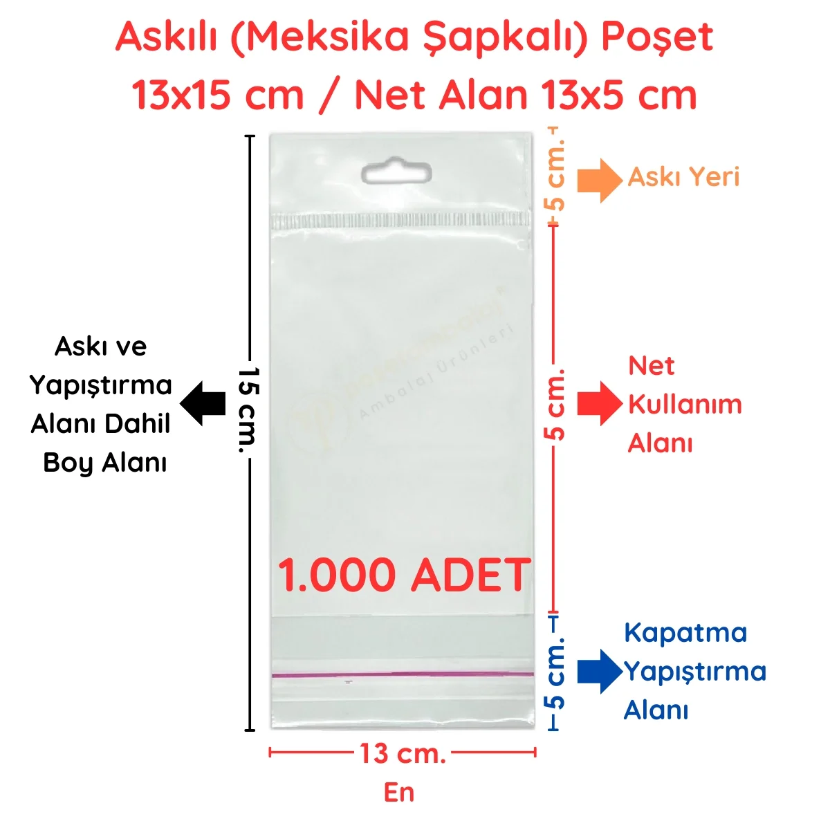 13x15 cm OPP Askılı Meksika Şapkalı Poşet, özellikle orta boy ürünlerin şık ve dikkat çekici şekilde sunulması için tasarlanmıştır. Şeffaf ve parlak OPP malzeme sayesinde ürün görünürlüğü maksimum düzeyde olurken, Meksika şapkası formundaki askılı üst bölümüyle mağaza sunumlarınıza fark katacaktır.