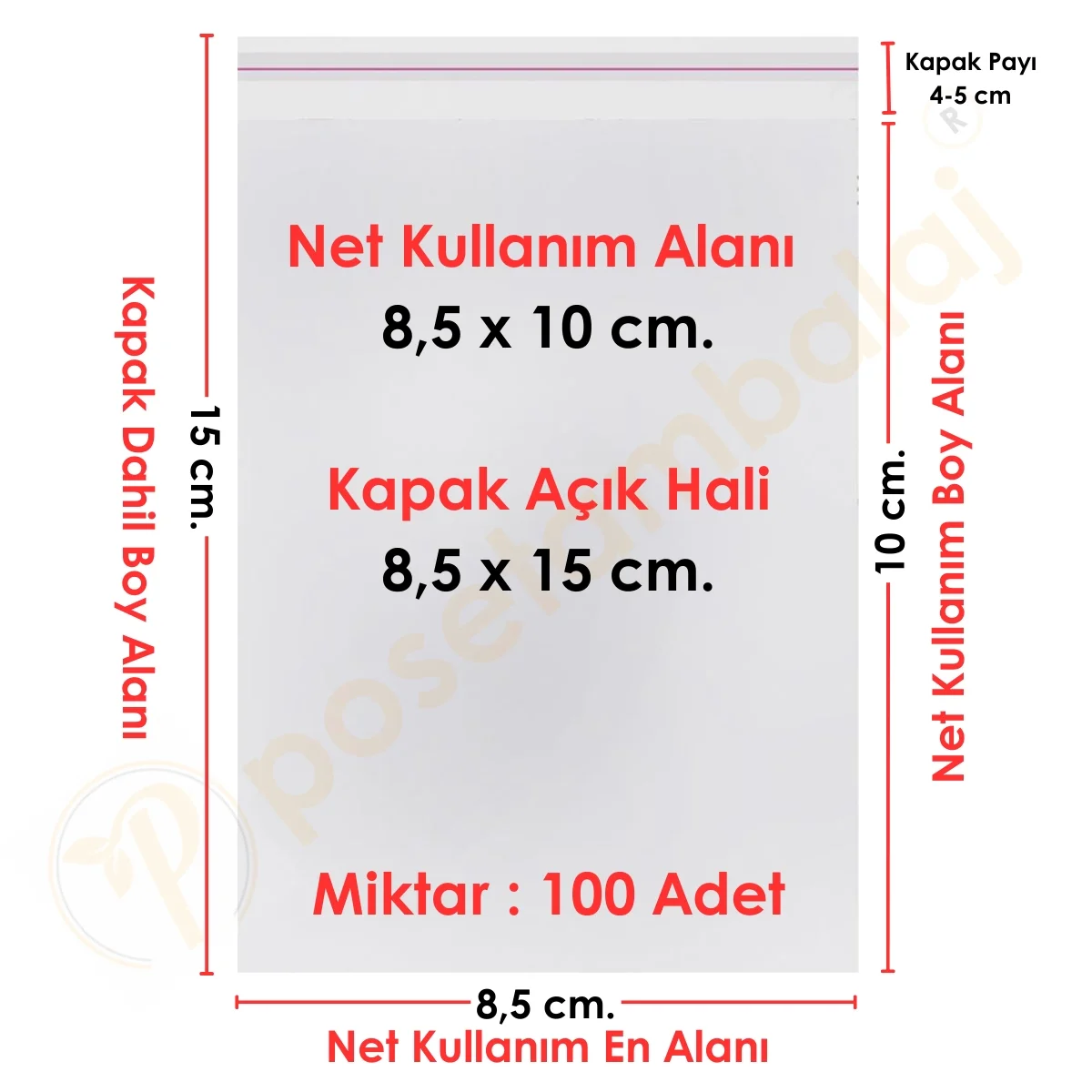 8,5x10+5 (8,5*15) cm boyutundaki 100 Adet Şeffaf Bantlı Yapışkanlı OPP Jelatin Poşet, kullanımı kolay ve pratik bir ambalaj çözümü sunar.