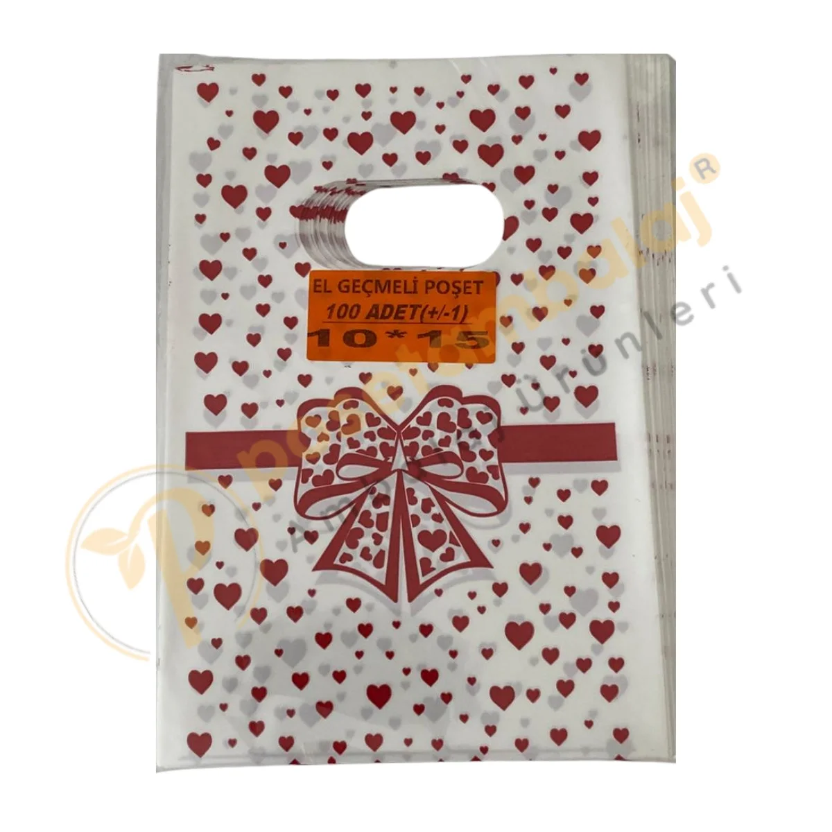 Beyaz zemin üzerine yerleştirilmiş kırmızı kalp desenleri ve orta bölümde yer alan kırmızı fiyonk tasarımı ile bu 10x15 cm hediyelik poşet, romantik ve zarif bir sunum arayanlar için özel olarak tasarlanmıştır.