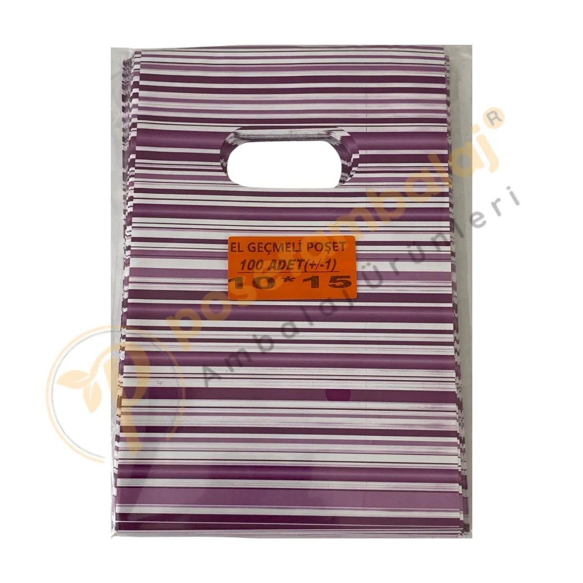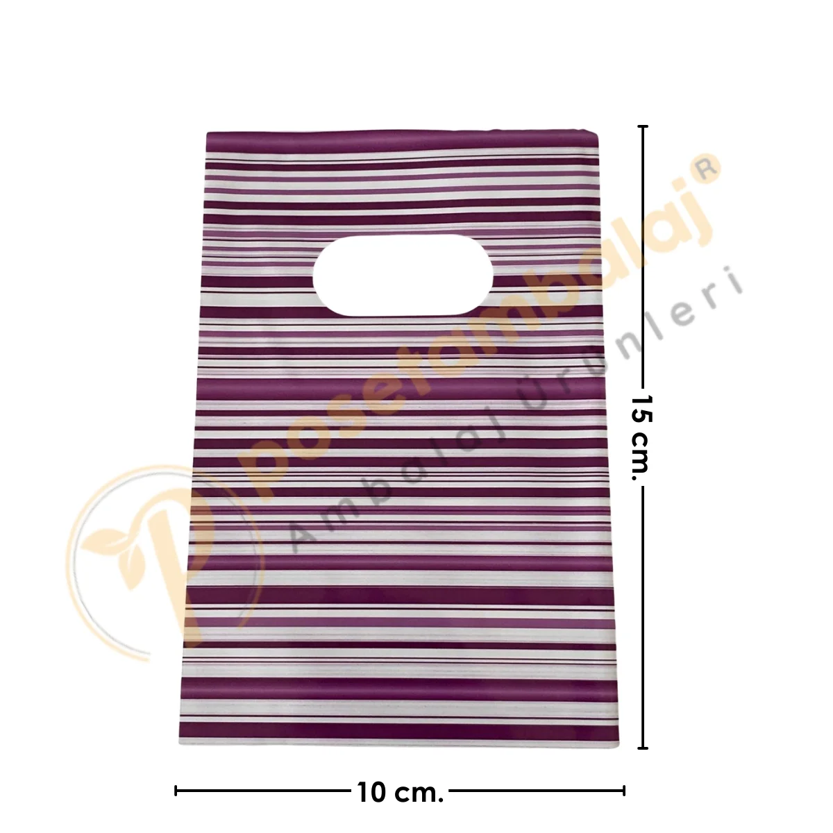 Mor tonlarının zarif uyumu ile tasarlanan çizgili desenli 10x15 cm hediyelik poşet, modern ve sade ambalaj tercih edenler için estetik bir çözümdür.